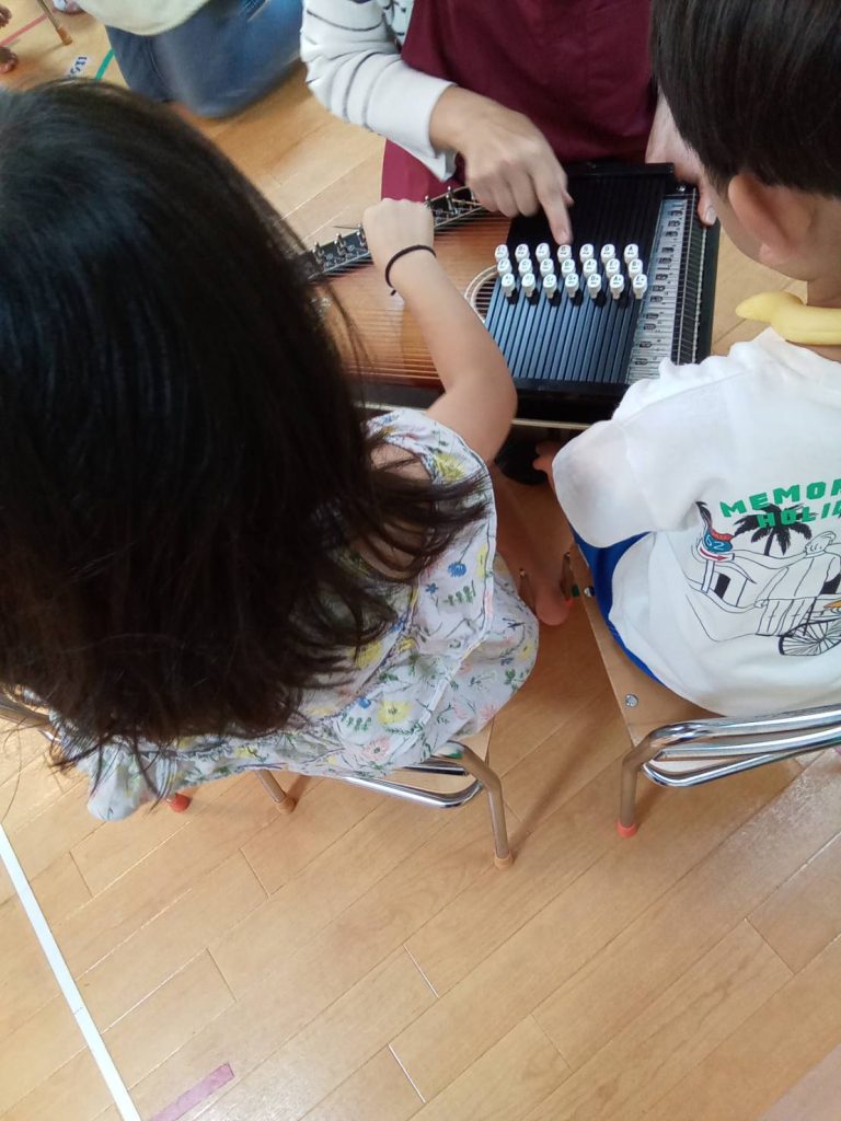 *オートハープを一人ずつならし、ピックで弦をはじく感覚と音を楽しみました。